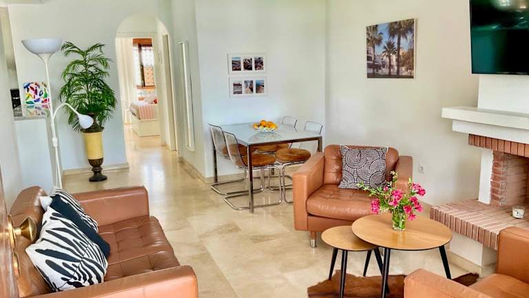 Die Ferienwohnung ist klimatisiert und umfasst 2 Schlafzimmer, ein Wohnzimmer sowie eine voll ausgestattete Küche mit Kühlschrank und Kaffeemaschine. Es gibt 2 Badezimmer, ausgestattet mit Bidet und Dusche. Handtücher und Bettwäsche sind ebenfalls vorhanden.