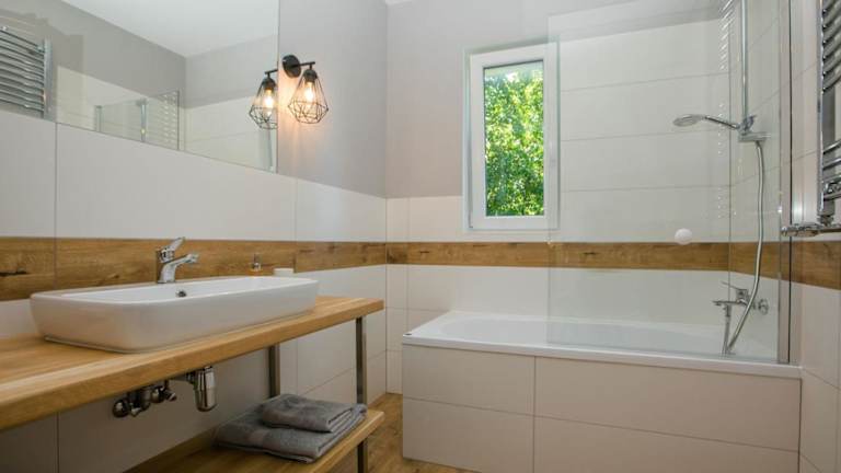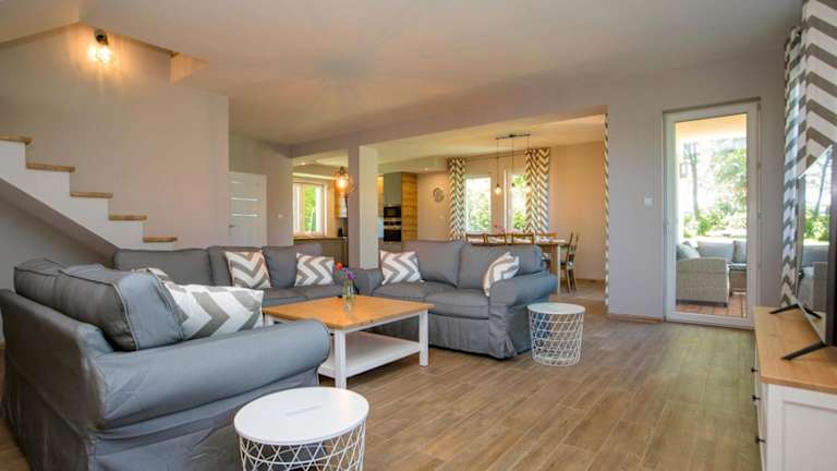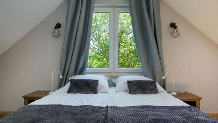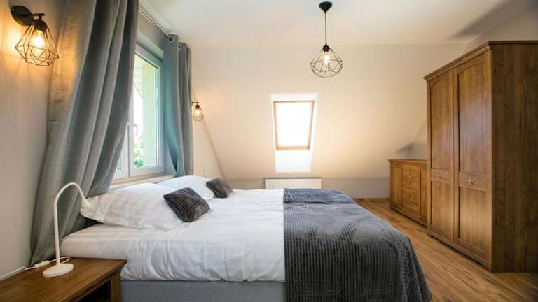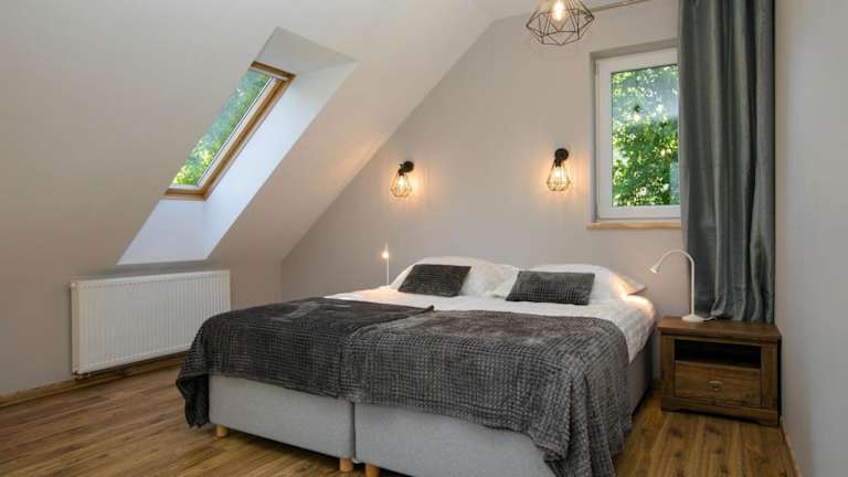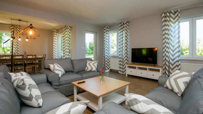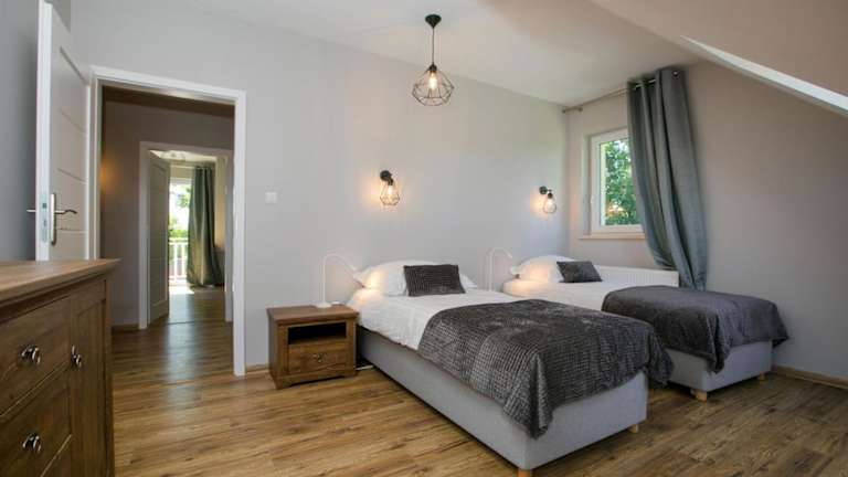 Das Grabina Mazury verfügt über 4 geräumige Schlafzimmer, die Platz für eine größere Gruppe bieten. Jedes Zimmer ist komfortabel eingerichtet und mit einem Flachbild-TV ausgestattet. Die voll ausgestattete Küche bietet alles, was Sie für die Zubereitung von Mahlzeiten benötigen, einschließlich Kühlschrank, Geschirrspüler, Waschmaschine, Backofen und Mikrowelle. Genießen Sie den Komfort eines eigenen Balkons oder einer Terrasse, von wo aus Sie den Blick auf den Garten genießen können.
