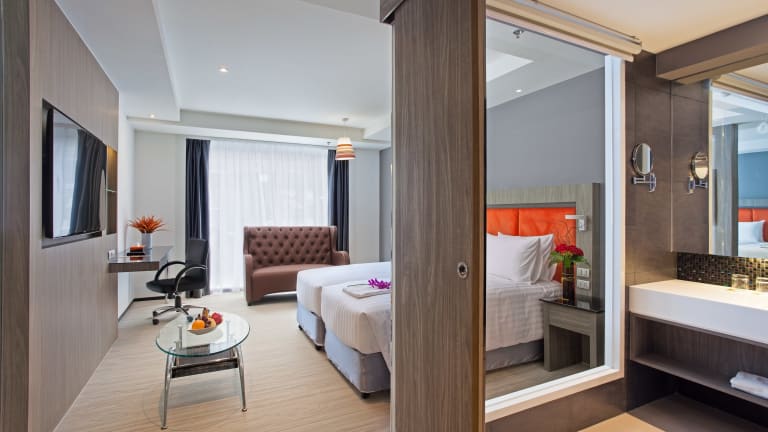 Das Grand 5 Hotel & Plaza Sukhumvit Bangkok liegt im Viertel Nana, einem lebhaften Viertel in Bangkok. Die Nana BTS Skytrain-Station ist nur wenige Gehminuten entfernt und bietet eine gute Anbindung an die Stadt. In der Umgebung finden Sie eine große Auswahl an Restaurants, Bars und Geschäften. Beliebte Sehenswürdigkeiten wie der Pratunam-Markt und der Lumpini-Park sind ebenfalls gut erreichbar. Vom internationalen Flughafen Bangkok-Suvarnabhumi trennen Sie etwa 40 Fahrminuten.