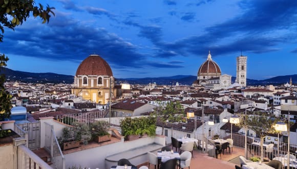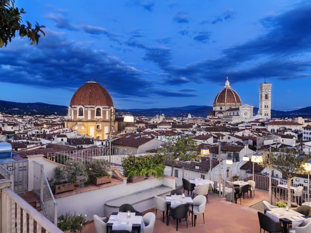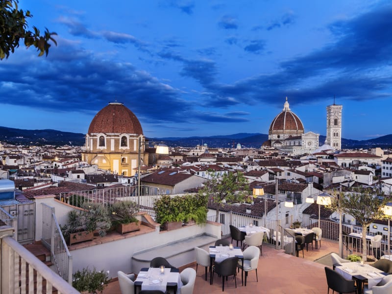Das B-Roof Restaurant im Grand Hotel Baglioni serviert Frühstück sowie typisch toskanische Küche zum Mittag- und Abendessen. Der Essbereich und die Terrasse bieten einen atemberaubenden Blick auf den Dom Santa Maria del Fiore und Giottos Glockenturm. Das Restaurant bietet den Gästen eine einzigartige kulinarische Erfahrung, bei der sie die köstlichen Speisen der Region genießen können.