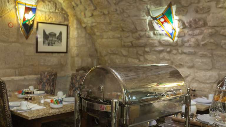 Im Hotel wird Ihnen jeden Morgen ein leckeres Frühstück serviert. Genießen Sie Ihre erste Mahlzeit des Tages im Frühstücksraum mit seiner beeindruckenden Gewölbedecke.