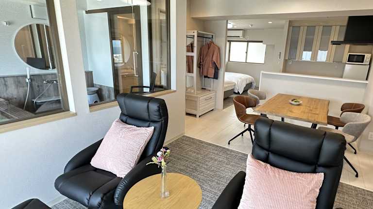 Die Zimmer sind im traditionellen japanischen Stil gestaltet und bieten eine Küchenzeile. Jedes Zimmer verfügt über Klimaanlage, ein eigenes Bad, Futonbetten auf Tatamiböden, einen TV, eine Mikrowelle und einen Kühlschrank. Zusätzlich sind einige Küchenutensilien verfügbar, die jedoch in begrenzter Anzahl zur Verfügung stehen.