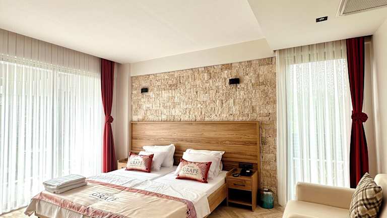 Das Grape Hotel bietet seinen Gästen eine Reihe von Annehmlichkeiten wie einen saisonalen Außenpool, einen eigenen Strandbereich sowie ein Restaurant. Zudem stehen eine Bar und ein Garten zur Verfügung. Eine rund um die Uhr besetzte Rezeption sorgt für die Betreuung der Gäste, während Zimmerservice angeboten wird. Das Hotel verfügt über Nichtraucherzimmer und bietet Platz für Familien.
