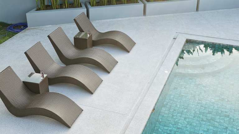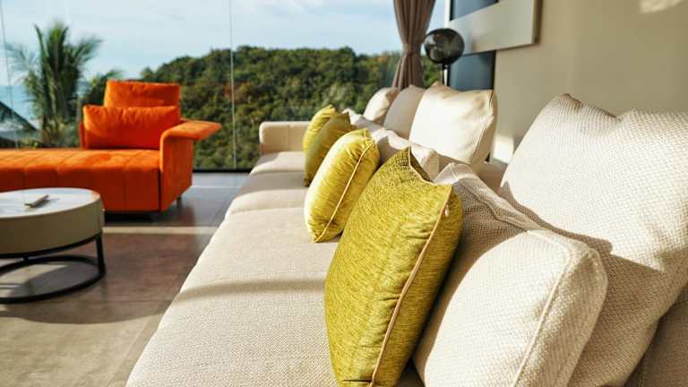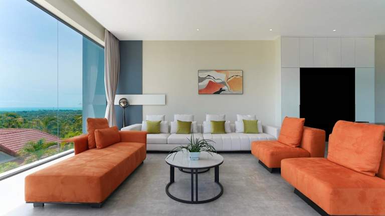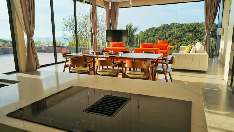 Die klimatisierte Villa umfasst 4 Schlafzimmer, ein Wohnzimmer, eine voll ausgestattete Küche mit Kühlschrank und Kaffeemaschine sowie 6 Badezimmer mit Bidet und Dusche. Handtücher und Bettwäsche werden bereitgestellt.