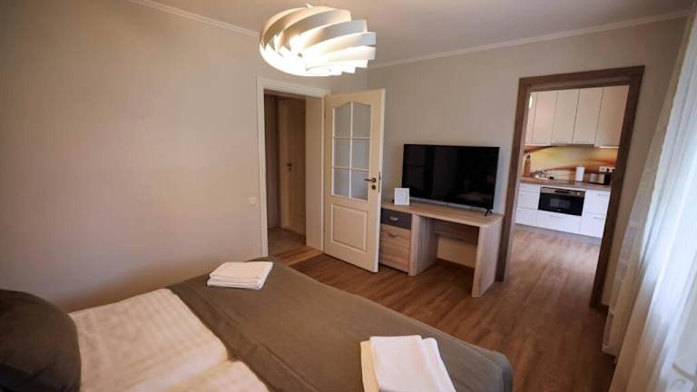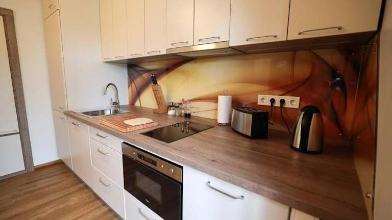 Die Ferienwohnung umfasst ein Schlafzimmer und ein Badezimmer. Zur Ausstattung gehören Bettwäsche, Handtücher, ein Flachbild-TV sowie eine voll ausgestattete Küche. Zudem steht eine Terrasse mit Blick auf den Garten zur Verfügung.