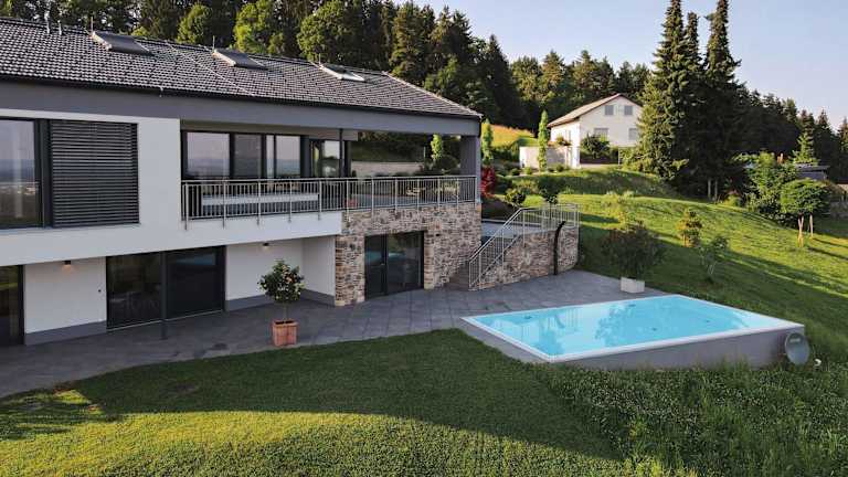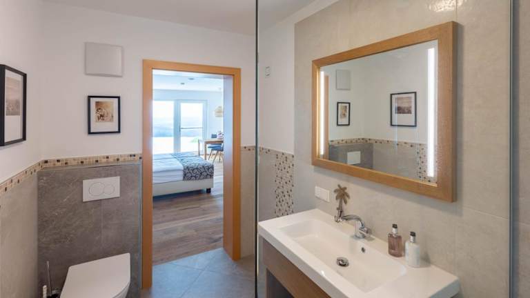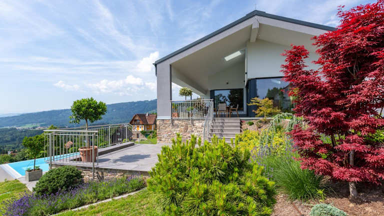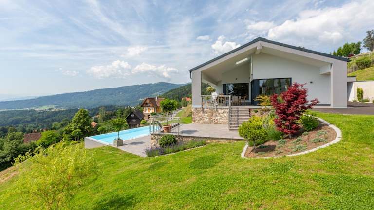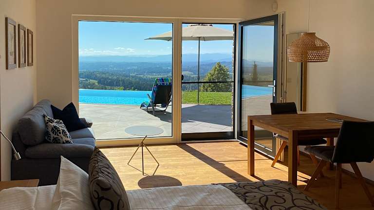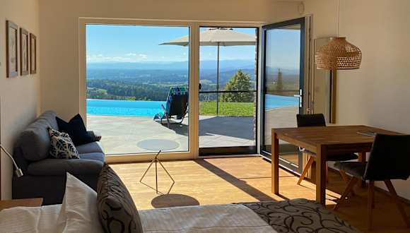 Greim 15 --- Apartment mit Pool und Fernsicht 30m2 ist eine moderne Ferienwohnung, die eine Terrasse sowie einen Garten bietet. Das Apartment hat eine Klimaanlage und ermöglicht einen Blick auf den Pool.