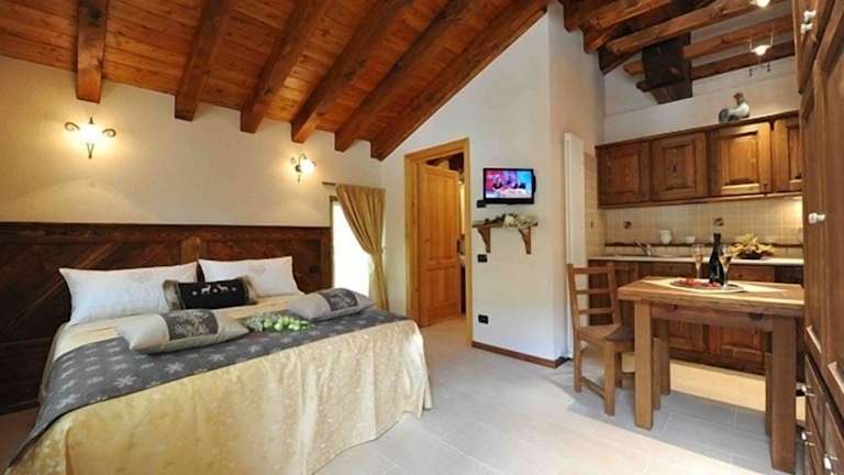 Die Studios in der Gresil Residence sind elegant eingerichtet und bieten eine gemütliche Atmosphäre. Die freiliegenden Deckenbalken und die Möbel im Landhausstil verleihen den Studios einen rustikalen Charme. Jedes Studio verfügt über eine voll ausgestattete Küchenzeile, einen Essbereich, einen Flachbild-TV mit Sky-Kanälen und einen DVD-Player. Vom eigenen Balkon aus können Sie den beeindruckenden Bergblick genießen. Kostenloses WLAN steht Ihnen ebenfalls zur Verfügung.