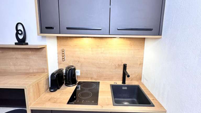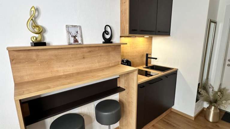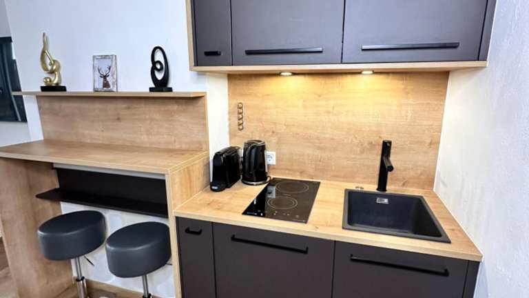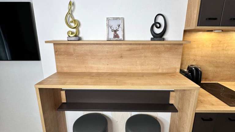Die Ferienwohnung besteht aus einem Schlafzimmer, einem Badezimmer, einem Essbereich und einer voll ausgestatteten Küche. Zusätzlich verfügt sie über Bettwäsche, Handtücher, einen Flachbild-TV mit Satellitenkanälen und eine Terrasse mit Blick auf die Berge.