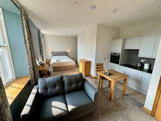 In den Apartments ist eine voll ausgestattete Küchenzeile vorhanden, die einen Kühlschrank, Geschirrspüler, Ofen und Wasserkocher umfasst. Ein Esstisch ermöglicht die Zubereitung und den Genuss eigener Mahlzeiten.