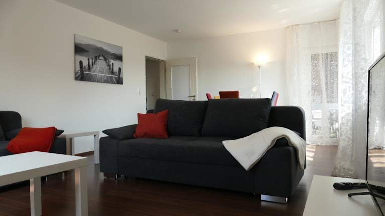 Die Ferienwohnung verfügt über zwei Schlafzimmer, ein Badezimmer mit Dusche und Badewanne, eine voll ausgestattete Küche mit Kühlschrank, Geschirrspüler und Ofen sowie ein Wohnzimmer mit Sitz- und Essbereich. Eine Spielekonsole sorgt für zusätzlichen Komfort. Handtücher und Bettwäsche werden bereitgestellt.