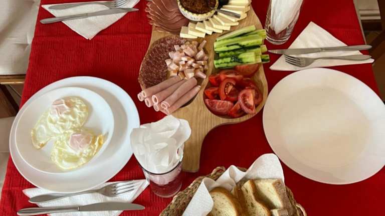 Genießen Sie ein köstliches amerikanisches Frühstück im Frühstücksbereich des Guest House Piatra Craiului, um gestärkt in den Tag zu starten.