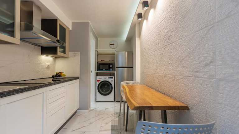 In der Unterkunft gibt es eine komplett ausgestattete Küche mit Kühlschrank, Mikrowelle und Herdplatte, die die Selbstverpflegung ermöglicht. Ein Essbereich ist ebenfalls vorhanden.