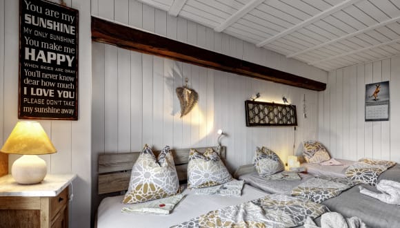 2 Zimmer für je max. 4 Personen in 1 Stock des Guesthouses Scadena mit je - 1 französischen Doppelbett (1.40 x 2 m) - 2 Einzelbetten (0.90 x 2 m) mit Gemeinschaftsbadezimmer auf demselben Stock HD-TV, Wasserkocher, Kaffeemaschine, Tee sind im Preis inbegriffen. Hunde übernachten gratis.