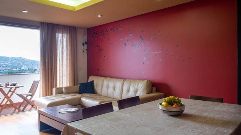 Die Ferienwohnung umfasst ein Wohnzimmer, einen Balkon sowie eine Küche, die mit einem Kühlschrank, einem Ofen, einer Mikrowelle, einer Kaffeemaschine und einem Wasserkocher ausgestattet ist. Zudem ist ein TV vorhanden.