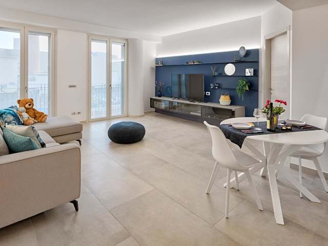 Die Ferienwohnung besteht aus einem Schlafzimmer, einem Wohnzimmer sowie einer voll ausgestatteten Küche, die mit einem Kühlschrank und einer Kaffeemaschine ausgestattet ist. Ein Badezimmer mit Bidet und Haartrockner ist ebenfalls vorhanden. Die Unterkunft stellt Handtücher und Bettwäsche zur Verfügung. Die Ferienwohnung ist klimatisiert und bietet Nichtraucherzimmer.