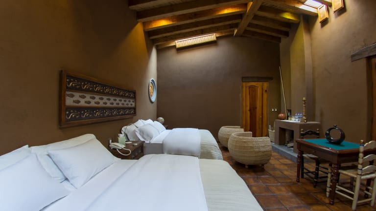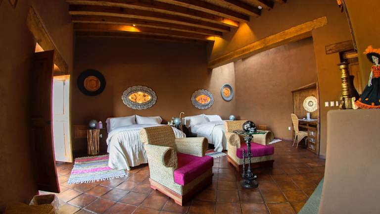 Die Suiten im Hacienda Ucazanaztacua sind geräumig und individuell gestaltet. Jede Suite verfügt über einen Balkon mit Blick auf den Pátzcuaro-See und die Inseln. Ein großer Sitzbereich mit Kamin und eine Auswahl an Kissen sind ebenfalls vorhanden. Allergikerfreundliche Zimmer sind verfügbar.