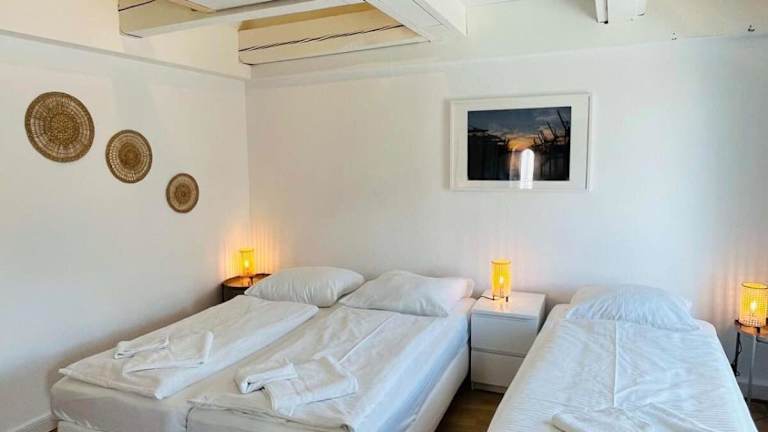 Die Ferienwohnung umfasst zwei Schlafzimmer, ein Wohnzimmer mit TV, eine voll ausgestattete Küche mit Kühlschrank und Geschirrspüler sowie ein Badezimmer mit Haartrockner. Handtücher und Bettwäsche werden bereitgestellt.