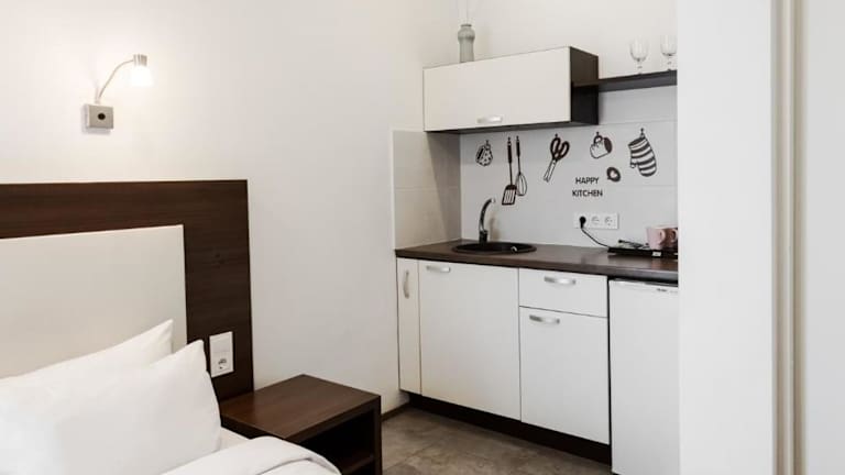 Die Zimmer im Happy Inn sind gut ausgestattet und bieten den Gästen Komfort und Bequemlichkeit. Einige Zimmer verfügen über eine Küche und einen Balkon, so dass die Gäste ihre eigenen Mahlzeiten zubereiten und die frische Luft genießen können. In jedem Zimmer finden Sie auch Tee- und Kaffeezubehör, Besteck, Bettwäsche und Handtücher. Die Gemeinschaftsbereiche des Hotels bieten zusätzliche Annehmlichkeiten wie eine Waschmaschine, einen Toaster, eine Mikrowelle, ein Bügeleisen und -brett sowie Tee- und Kaffeezubehör.