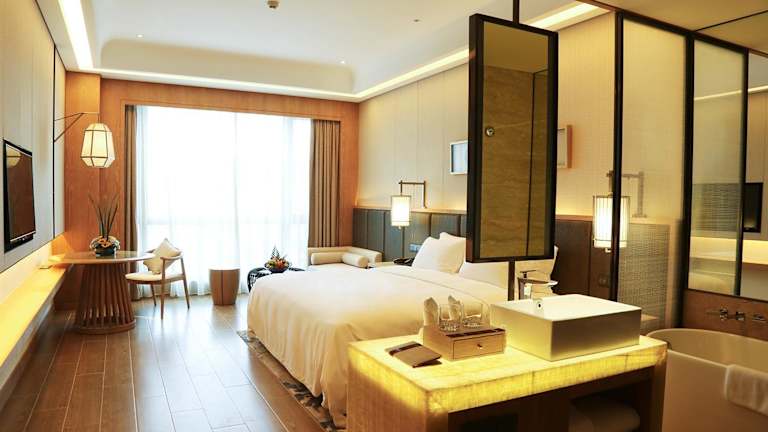 Die Zimmer im Harman Resort Hotel Sanya sind stilvoll eingerichtet und bieten einen komfortablen Rückzugsort nach einem erlebnisreichen Tag. Alle Zimmer verfügen über Annehmlichkeiten wie Flachbild-Kabel-TV, einen Wasserkocher und ein eigenes Bad mit Dusche. Einige Zimmer bieten auch einen Meerblick und einen gemütlichen Sitzbereich.