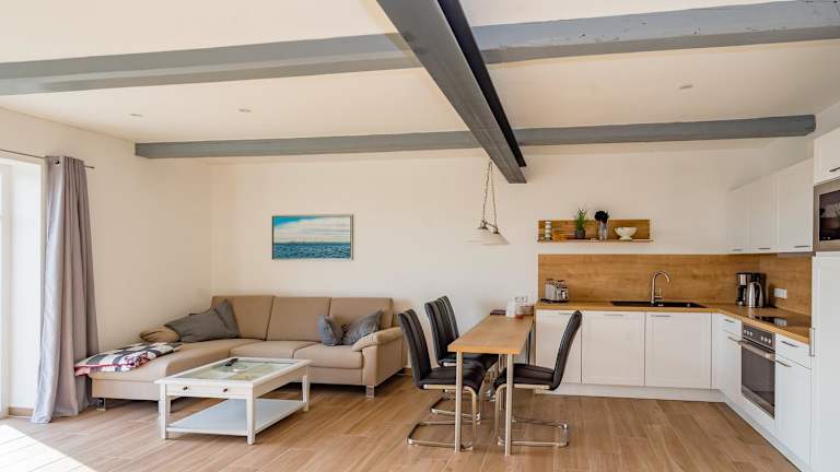 Die Unterkunft ist ausgestattet mit einer Küche, die unter anderem einen Kühlschrank, Geschirrspüler, Ofen, Mikrowelle, Herdplatte, Kaffeemaschine und Wasserkocher beinhaltet.