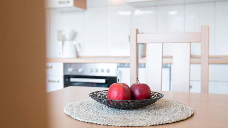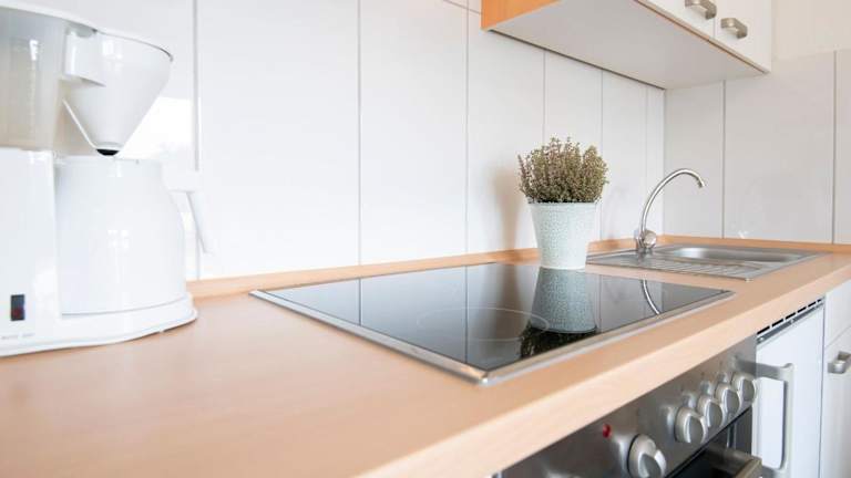 Die Unterkunft umfasst ein Schlafzimmer, eine gut ausgestattete Küche mit Kühlschrank und Ofen, ein Wohnzimmer sowie einen Fernseher.