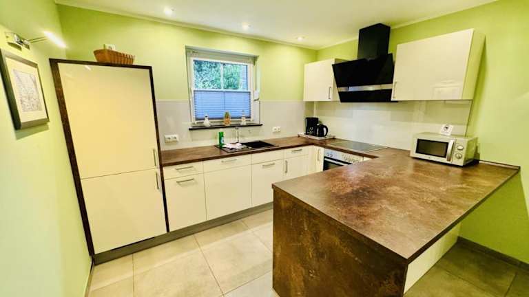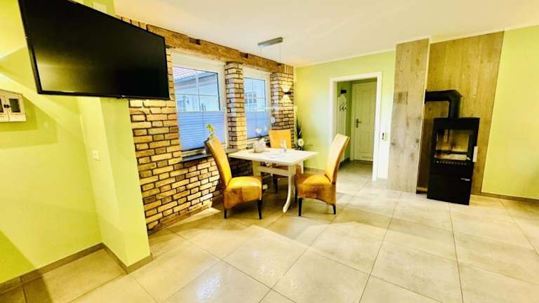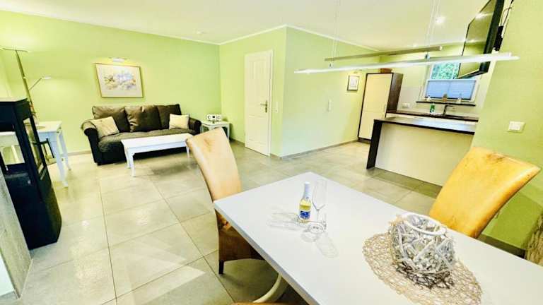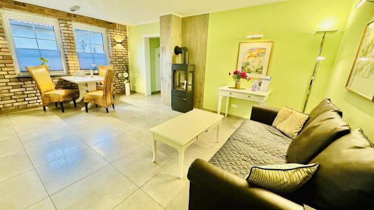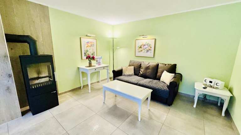 Die Ferienwohnung besteht aus einem Schlafzimmer und einem Wohnzimmer, das mit einer voll ausgestatteten Küchenzeile ausgestattet ist. Diese beinhaltet einen Kühlschrank und eine Kaffeemaschine. Außerdem stehen den Gästen ein Badezimmer mit Dusche und Haartrockner sowie ein TV mit Kabelkanälen zur Verfügung.