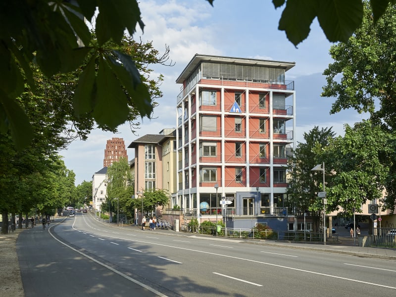 Mittendrin, das ist die einfachste Beschreibung. Die Jugendherberge liegt direkt am Mainufer in Sachsenhausen gegenüber der Frankfurter Innenstadt. Die Anbindung an den ÖPNV ist ideal: per Tram, Bus, S-Bahn und Fernzug ist die Errichbarkeit gewährleistet. Auch Gäste, die mit dem Auto anreisen, finden nur wenige Gehminuten entfernt, ein großes öffentliches Parkhaus. Für Busse gibt es einen kostenlosen Busparkplatz.