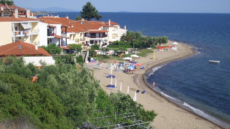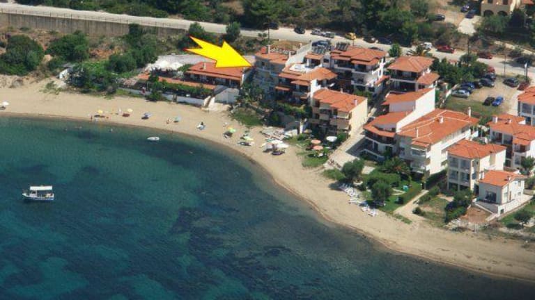 Das Haus des Vaters ist eine der besten Anlagen, die wir im Angebot haben. Der Inhaber führt das Haus nach deutschen Maßstäben. Er hat das Hotel in den 90ern ursprünglich für sich und seine Kinder gebaut und ausgestattet. Inzwischen haben sich die Kinder in anderen Berufen entwickelt und leben heute in Thessaloniki. Nur dadurch sind wir in der Lage, Ihnen dieses einmalige Haus anbieten zu können. In einer malerischen Bucht zwischen dem 1 Finger der Chalkidiki (Kassandra) und der Mönchsrepublik Athos gelegen verfügt das Haus über direktem Strandzugang. Bis zum Meer sind es nur 5 Meter. Die Bucht ist windgeschützt und bietet puderfeinen weißen Sandstrand. Es handelt sich um eine außergewöhnliche schöne Umgebung, die keine Wünsche offen läßt. Genießen Sie am Strand oder aber auf Ihrer Terrasse ein ausgiebiges Frühstück zum Sonnenaufgang oder ein Glas Wein zum Sonnenuntergang, beides wird unvergesslich bleiben. Parkplätze für den mitgebrachten Wagen oder aber für den Leihwagen sind am Haus vorhanden. Eine großartige Möglichkeit in Griechenland Urlaub zu machen, wenn Sie wollen rund um die Uhr in Badekleidung. Der Strand und das Meerwasser sind auch im Jahr 2009 für ihre sehr gute Qualität mit der blauen Flagge ausgezeichnet worden. Rundum ein Urlaubsdomizil, das keine Wünsche offen läßt. Das bedeutet Sandstrand vom feinsten, türkis blaues Wasser und flach abfallende Strandabschnitte. Unser Büro ist nur ca. 800 m. vom Haus des Vaters entfernt, so dass wir mit all unseren Serviceleistungen und Angeboten zur Verfügung stehen. Der ortsansässige Bäcker Nikos Karpetis fährt täglich um ca. 9:00 Uhr mit seinem kleinen Lieferwagen das "Haus des Vaters" an, bietet backfrische Brötchen und andere Leckereien an. So können unsere Gäste jeden Morgen auf Ihren Terrassen oder Balkonen, mit Aussicht auf
