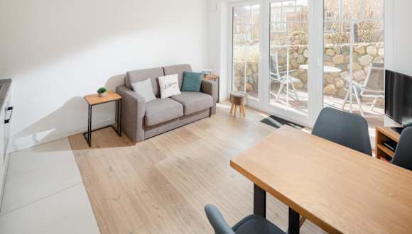 Die Ferienwohnung verfügt über ein Schlafzimmer, eine voll ausgestattete Küche mit Kühlschrank und Geschirrspüler sowie ein Badezimmer mit Dusche, Haartrockner und Waschmaschine. Handtücher und Bettwäsche werden bereitgestellt.