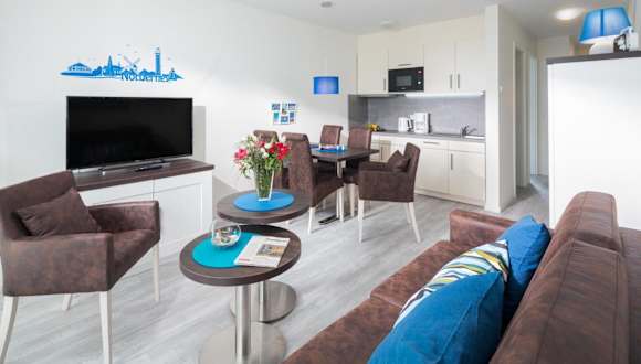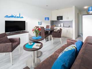 Die Ferienwohnung verfügt über zwei Schlafzimmer, einen Fernseher und eine voll ausgestattete Küche. Zur Küchenausstattung gehören ein Geschirrspüler, eine Mikrowelle und eine Waschmaschine.