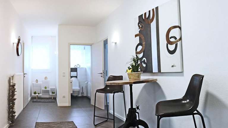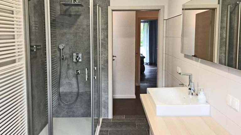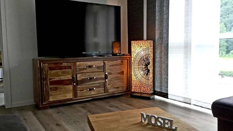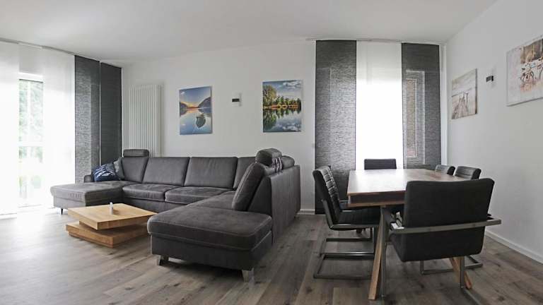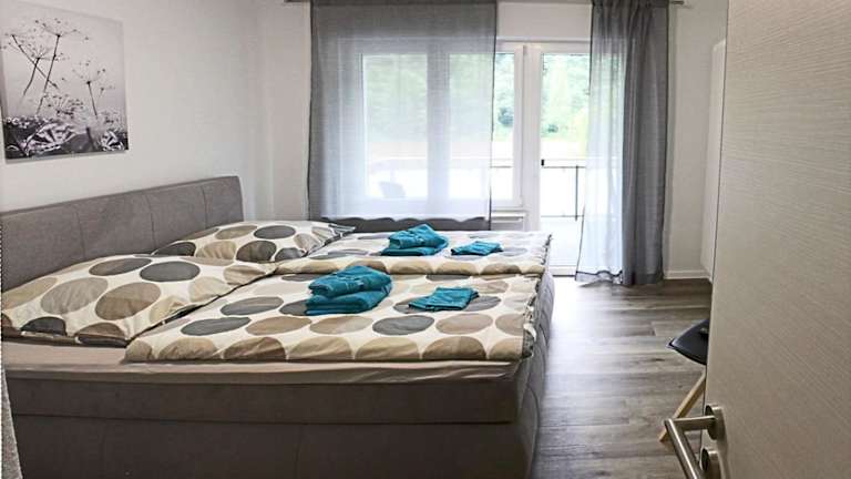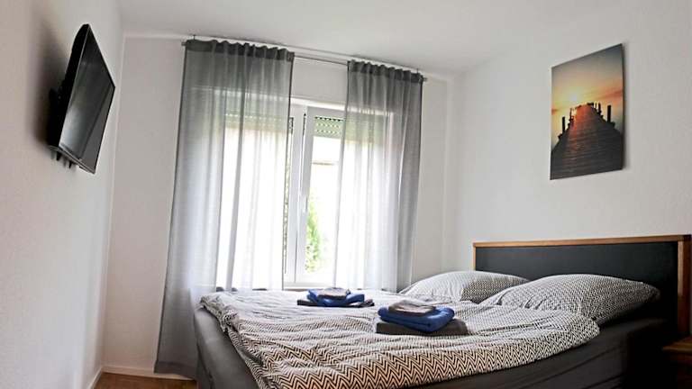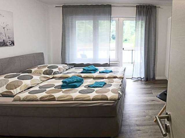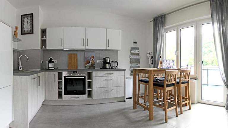 Die Ferienwohnung umfasst zwei Schlafzimmer, ein Wohnzimmer, ein Badezimmer mit Dusche sowie eine gut ausgestattete Küche, die unter anderem mit einem Kühlschrank und einem Geschirrspüler ausgestattet ist. Von dem Balkon aus hat man einen Blick auf den Fluss. Zur Ausstattung gehören außerdem Handtücher und Bettwäsche.