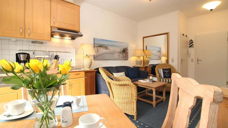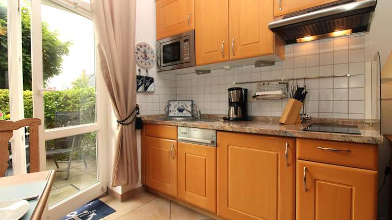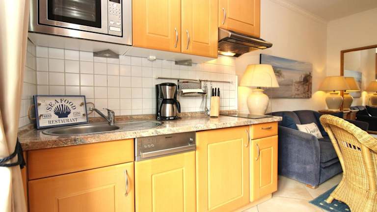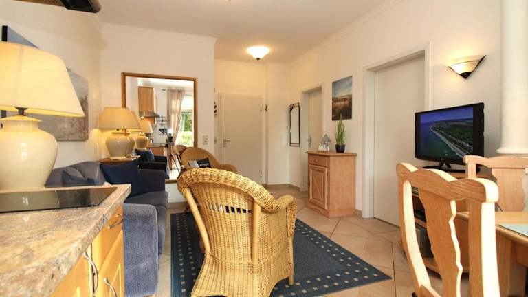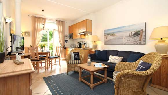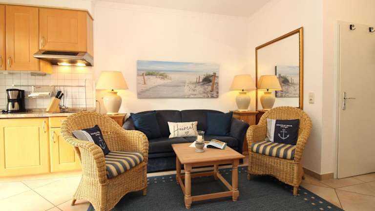 Die Ferienwohnung verfügt über ein Schlafzimmer, ein Wohnzimmer, eine gut ausgestattete Küche mit Kühlschrank und Geschirrspüler, TV, Blu-ray-Player sowie eine Terrasse. Alle öffentlichen und privaten Bereiche sind Nichtraucherzonen.