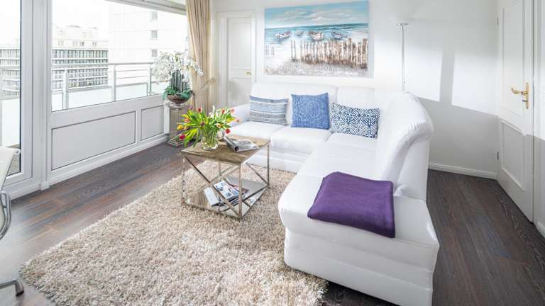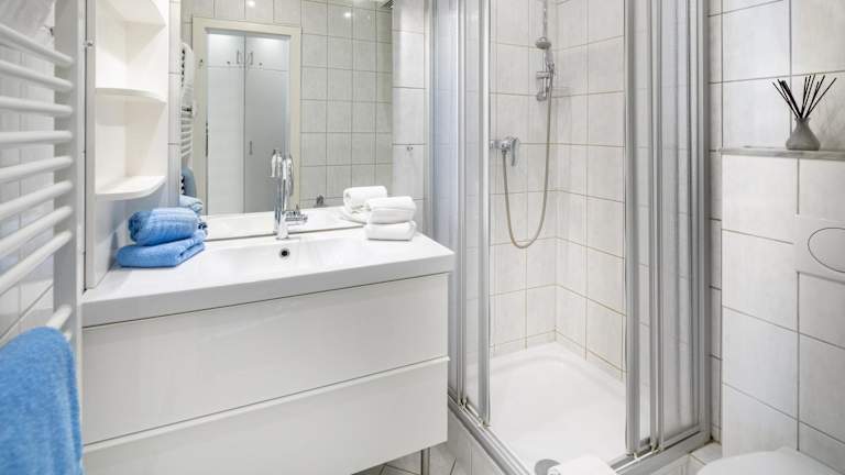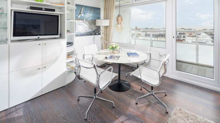 Die Wohnung umfasst ein Schlafzimmer, ein Wohnzimmer, einen Balkon mit Meerblick und ist mit einem Fernseher ausgestattet. Die gut ausgestattete Küche beinhaltet einen Kühlschrank und einen Geschirrspüler. Zudem umfasst die Ferienwohnung ein Badezimmer mit Dusche. Handtücher und Bettwäsche werden bereitgestellt.