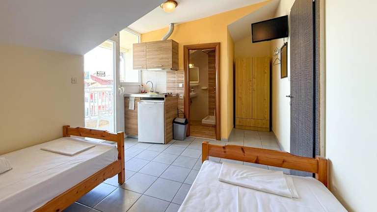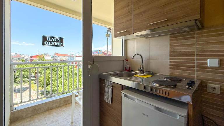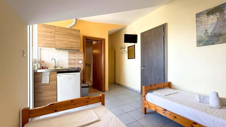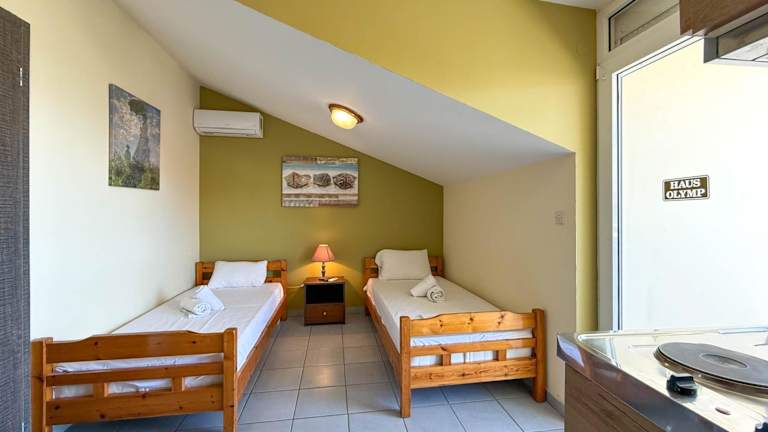 Das Hotel Haus Olymp verfügt über gemütliche Studios und Apartments, die sich ideal für Selbstversorger eignen. Die Zimmer sind einfach eingerichtet und verfügen über helles Holzmobiliar und Fliesenböden. Zur Ausstattung gehören eine Klimaanlage, ein TV und eine voll ausgestattete Küche mit Kühlschrank und Geschirr.