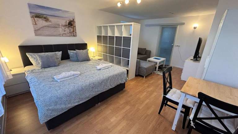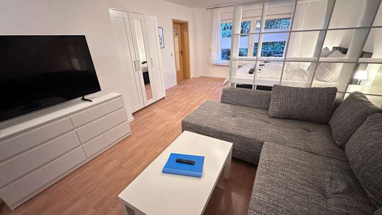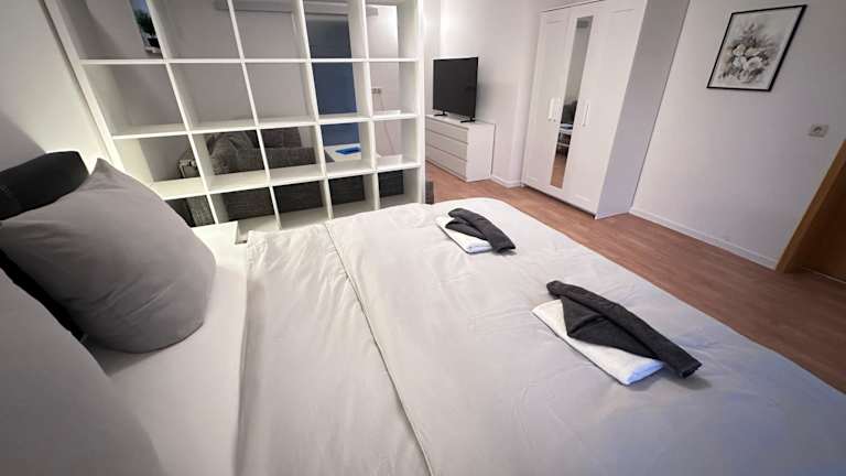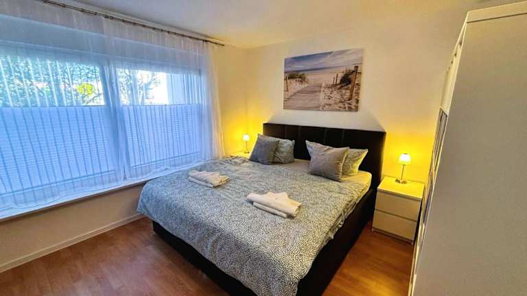 Die Ferienwohnung verfügt über ein Schlafzimmer und ist ausgestattet mit einem Flachbild-TV mit Kabelkanälen. Die voll ausgestattete Küche umfasst einen Kühlschrank, einen Geschirrspüler, eine Waschmaschine, einen Ofen und eine Mikrowelle. Handtücher und Bettwäsche werden bereitgestellt.
