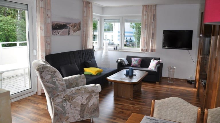Die Ferienwohnung liegt im Erdgeschoss und bietet auf ca. 50qm² einen Wohn- und Schlafraum für maximal 5 Personen. Sie ist ausgestattet mit einer Essecke, einem Schrankbett, einer Doppelcouch, einem Flachbild-TV, Radio und WLAN sowie einem Schlafzimmer mit Doppelbett. In der komplett eingericheteten Küche (E-Herd mit 4 Herdplatten, Backofen, Kühlschrank mit Gefrierfach) gibt es zusätzlich eine Mikrowelle, eine Kaffemaschine, einen Wasserkocher und einen Toaster. Neben dem Bad mit Dusche/WC wird der Wohnraum durch einen großen Balkon ergänzt. Im Keller befinden sich eine Sauna (kostenpflichtig), ein Waschraum mit Münzwaschmaschine und -trockner sowie ein Fahrradkeller. Zwei Fahrräder sowie ein PKW-Stellplatz stehen ebenfalls zur Verfügung. Die Wohnung ist eine Nichtraucherwohnung.
