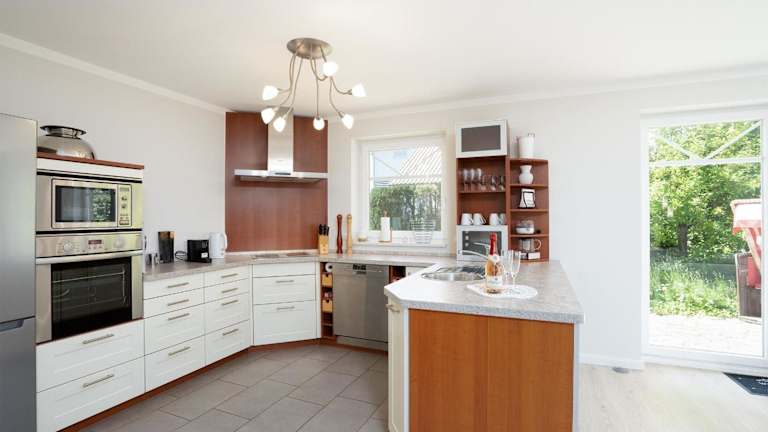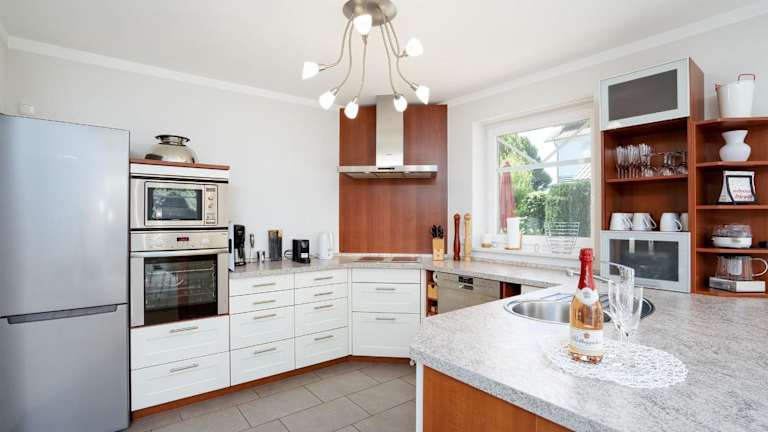 Die Unterkunft beinhaltet eine voll ausgestattete Küche, die mit Kühlschrank, Geschirrspüler, Waschmaschine, Ofen und Mikrowelle ausgestattet ist, was den Gästen die Möglichkeit bietet, ihre eigenen Mahlzeiten zuzubereiten.