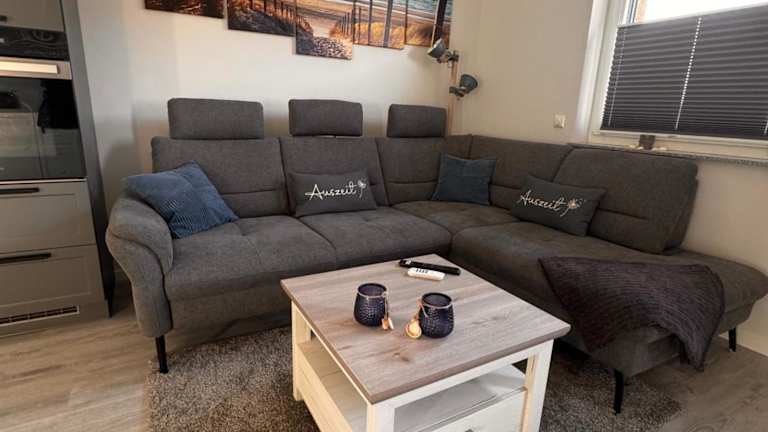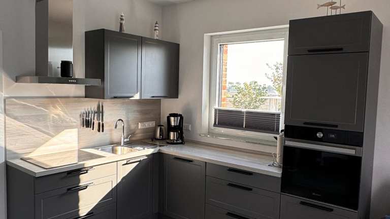 Jede Ferienwohnung ist mit einer voll ausgestatteten Küche versehen, die Kühlschrank, Geschirrspüler, Ofen, Kaffeemaschine und Wasserkocher umfasst, sowie einem Esstisch.