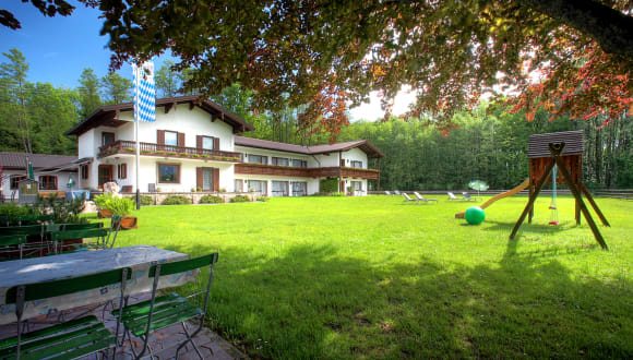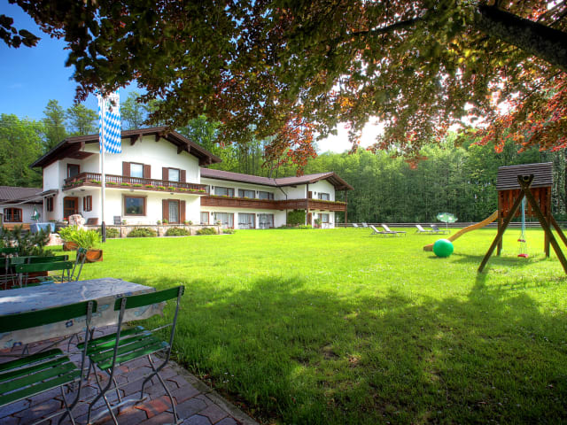 Erlauben Sie sich eine Erholung auf unserer großen Liegewiese und genießen sie desn Ausblick auf die Berge. Die Kinder können sich auf dem hoteleigenen Spielplatz vergnügen.