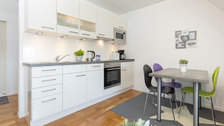 Die Unterkunft bietet eine Küche mit Kühlschrank und Geschirrspüler. Gegen Gebühr kann ein Bettwäschepaket bereitgestellt werden, alternativ können die Gäste Handtücher und Bettwäsche selbst mitbringen.