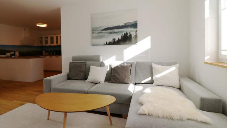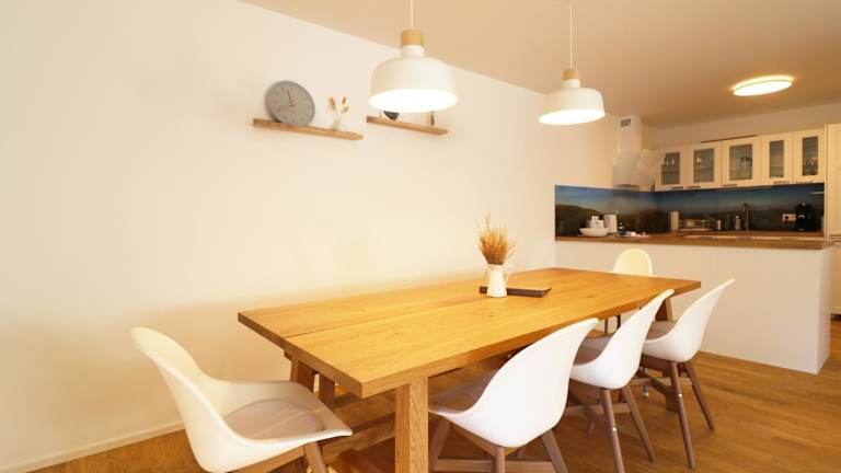 Die Ferienwohnung verfügt über einen Balkon, zwei Schlafzimmer, ein Wohnzimmer sowie eine gut ausgestattete Küche mit Kühlschrank und Geschirrspüler. Handtücher und Bettwäsche werden bereitgestellt.