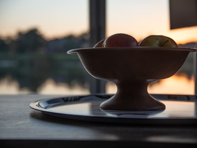 Optima & Optimo - die Zwillingsboote Wohnen am Nixensteg- da werden Träume wahr. Die Fahrt nach Schweden können Sie sich sparen, denn hier erwartet Sie Natur pur! Bootsausstattung: Die Boote sind gleich geschnitten und unterscheiden sich nur farblich in der Einrichtung. Geräumiger Eingangsbereich mit Schiebetürenschrank und Garderobe. Schlafzimmer mit Doppelbett 1,80 m mit verdunkelbaren Fenstern , großzügiges Duschbad mit WC, Volleingerichtete Küche im Wohnbereich (Kühlschrank mit Gefrierschrank, Herd mit Ceranfeld, Backofen, Spülmaschine, Kaffeemaschine, Toaster, Wasserkocher usw.) Wohnzimmer: Tisch mit 4 gemütlichen drehbaren Stühlen, außerdem befindet sich hier ein Sofa mit einer weiteren Schlafmöglichkeit (Komfortmatratze mit 1,60 m) vor dem Panoramafenster, mit Beistelltisch. Hier ist der Sonnenaufgang vom Bett aus zu sehen.