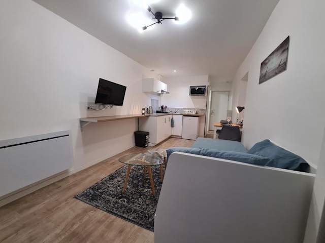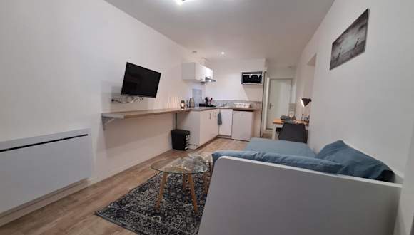 Die Ferienwohnung umfasst ein Schlafzimmer, einen Flachbild-TV und eine voll ausgestattete Küche.