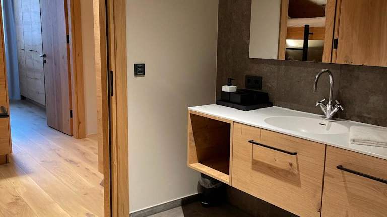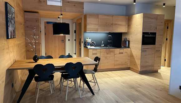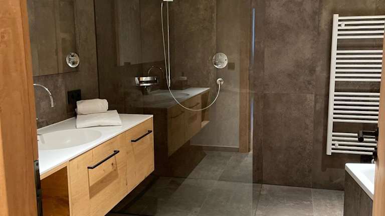 Das Appartement umfasst ein klimatisiertes Schlafzimmer und verfügt über insgesamt drei Badezimmer, ausgestattet mit Dusche, Badewanne und Haartrockner. Die Küche ist mit einem Kühlschrank, Geschirrspüler, Ofen, Kaffeemaschine und Wasserkocher ausgestattet.