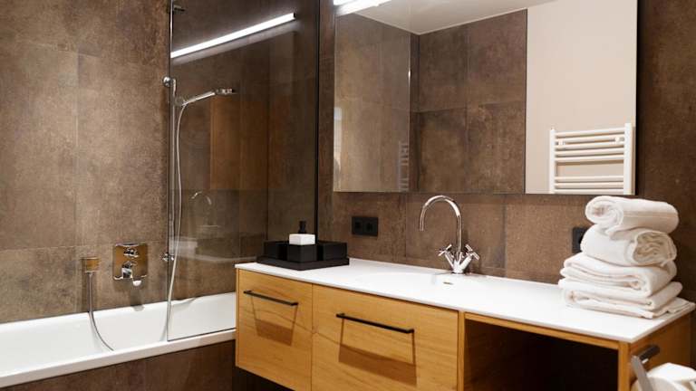 Die Ferienwohnung verfügt über 3 Schlafzimmer und 3 Badezimmer. Zur Ausstattung gehören zudem Bettwäsche, Handtücher, ein Fernseher mit Satellitenkanälen, eine voll ausgestattete Küche und eine Terrasse mit Blick auf die Berge.