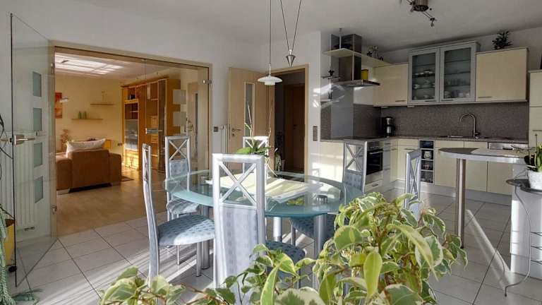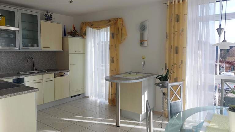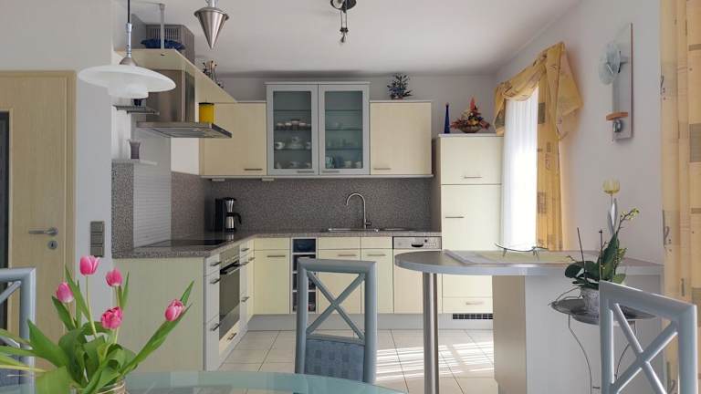 Die Ferienwohnung ist ausgestattet mit einer gut eingerichteten Küche, die einen Kühlschrank und einen Geschirrspüler umfasst. Außerdem werden Handtücher und Bettwäsche bereitgestellt.