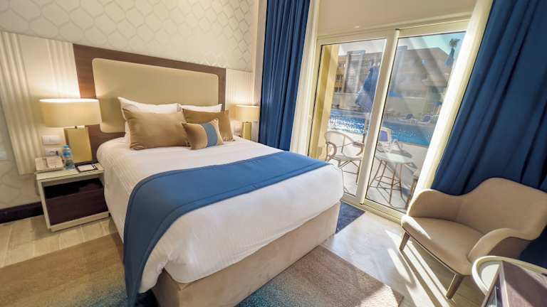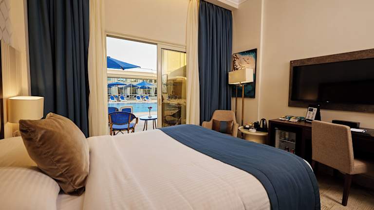 Die klimatisierten Zimmer sind mit einem Balkon oder einer Terrasse ausgestattet, die einen Blick auf den Pool bieten. Zur Ausstattung gehören ein Doppelbett, ein Flachbild-TV, ein Safe, Internetzugang und Telefon. Die Badezimmer sind mit einer Dusche und Badewanne ausgestattet und bieten einen Haartrockner sowie einen Kosmetikspiegel. Bettwäsche und Handtücher sind ebenfalls vorhanden.