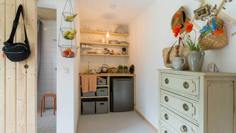 Die Ferienwohnung verfügt über ein Schlafzimmer, einen TV und eine Küche, die mit einem Kühlschrank ausgestattet ist.
