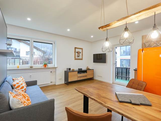 Die Ferienwohnung besteht aus einem Schlafzimmer und einem Badezimmer. Zudem sind Bettwäsche und Handtücher vorhanden. Ein Flachbild-TV, ein Essbereich, eine voll ausgestattete Küche und ein Balkon mit Blick auf die Berge komplettieren die Ausstattung.