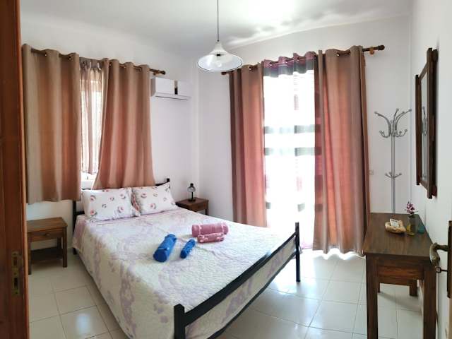 Die Ferienwohnung umfasst ein separates Schlafzimmer, ein Wohnzimmer, eine voll ausgestattete Küche mit Kühlschrank und Ofen sowie ein Badezimmer. Handtücher und Bettwäsche werden bereitgestellt. Die Räume sind klimatisiert und bieten den Gästen einen komfortablen Aufenthalt.